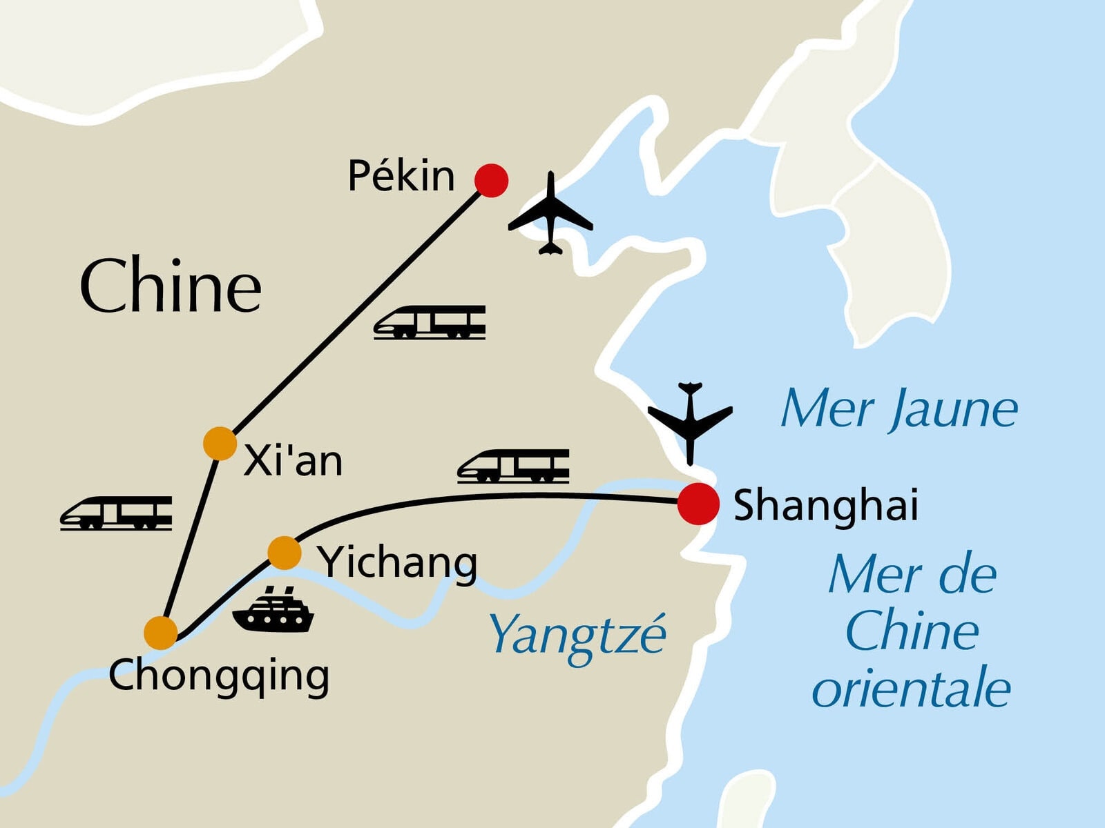 Le train rapide nous amène en environ six à sept heures à Yichang, où nous montons à bord de notre navire premium le soir. Le 6ᵉ jour commence notre croisière sur le Yangtzé, le plus long fleuve de Chine. Dans les jours suivants, nous traversons trois gorges célèbres : la pittoresque gorge de Xiling, la gorge de Wu avec ses douze hauts sommets et la majestueuse gorge de Qutang. De plus, nous faisons trois excursions à terre, une excursion informative au barrage des Trois Gorges avec la plus grande centrale hydroélectrique du monde, une balade en bateau sur un petit affluent du Yangtzé et une autre excursion dans la région pittoresque du Mont Shuanggui (selon la compagnie de navigation et les conditions météorologiques ou le niveau de l’eau). Le 9ᵉ jour, nous atteignons Chongqing, où notre croisière se termine. De là, nous continuons en train rapide vers Xi’an. Selon l’heure de débarquement et l’horaire du train, nous avons le temps pour une visite de la ville à Chongqing ou à Xi’an.